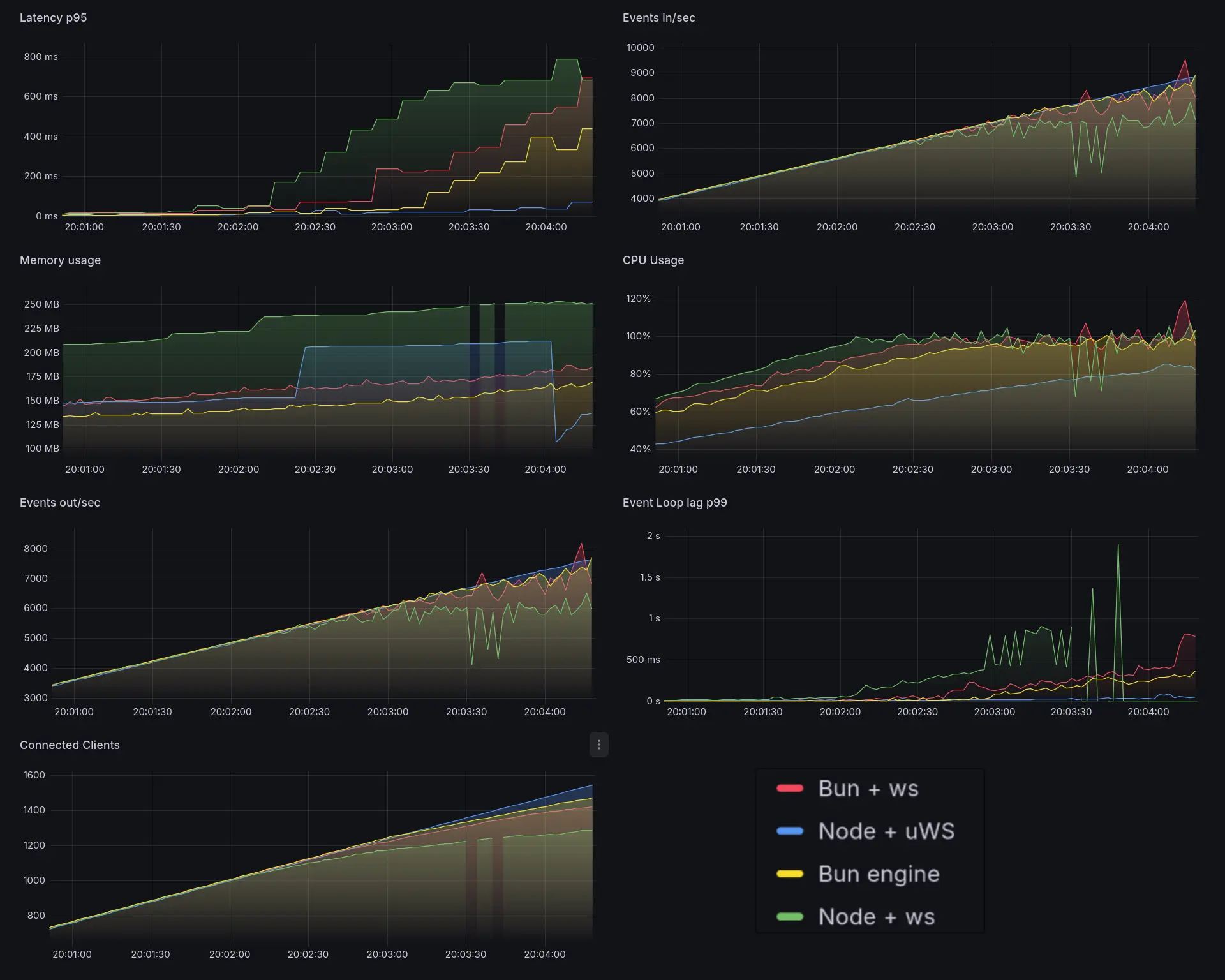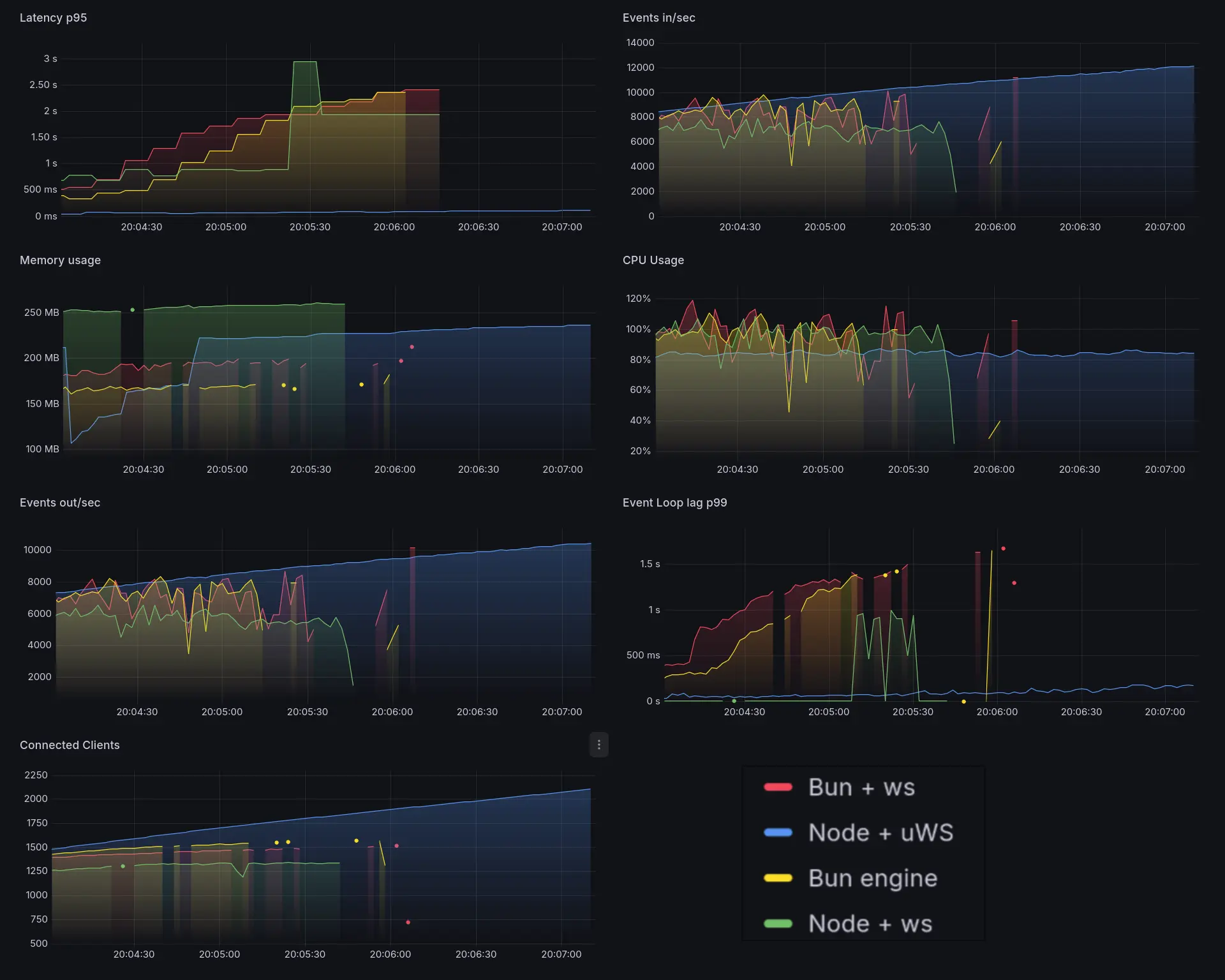 node-ws, bun-ws, and bun-native are all now effectively dead. Latency is through the roof.