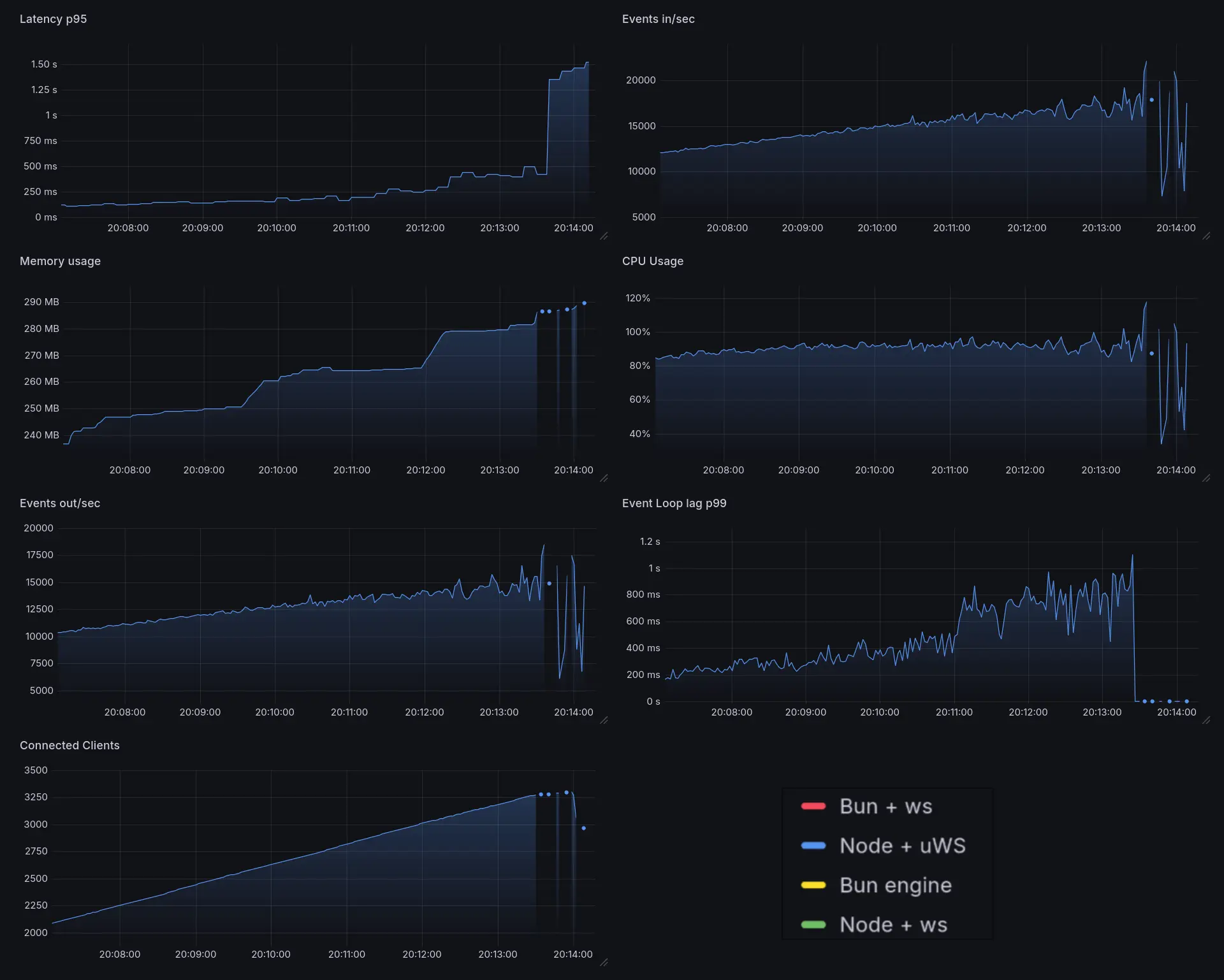 Basically node-ws just can't handle the load. You can see the server metrics missing in some places. Meanwhile node-uws is just chilling with flat latency and event loop lag.